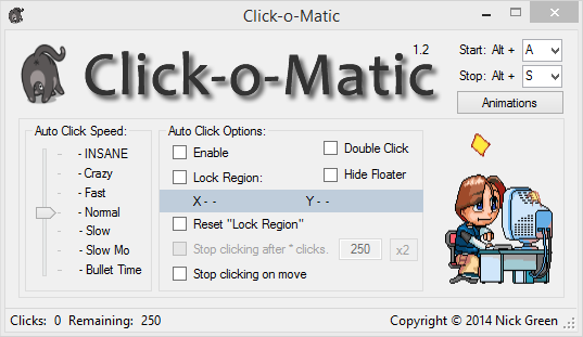 To define the area where you want to click, you can use the ‘Lock Region’ feature, and you can also set it to ‘Stop When Moved’. Moreover, Click-o-Matic lets you configure the amount of button presses that you need by inputting the number in a dedicated field.