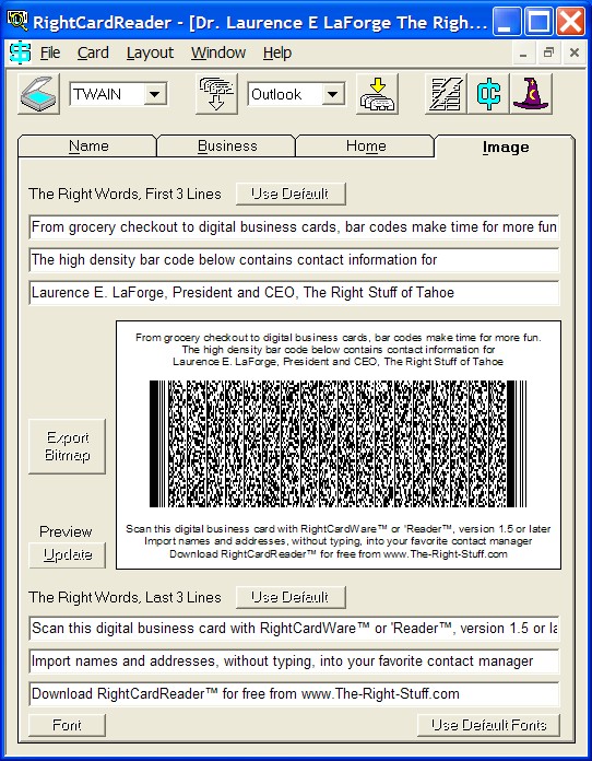 RightCardReader is a software application that will help you scan the digital business cards you have created with the RightCardWare. The RightCardReader will allow you to take the encoded business card contact information and move it personal information manager softwares (PIMs) (i.e. Microsoft Outlook). RightCardReader will also export the acquired data to vCards or PIMs that read and write vCards. Limitations: ■ Some functions are disabled.